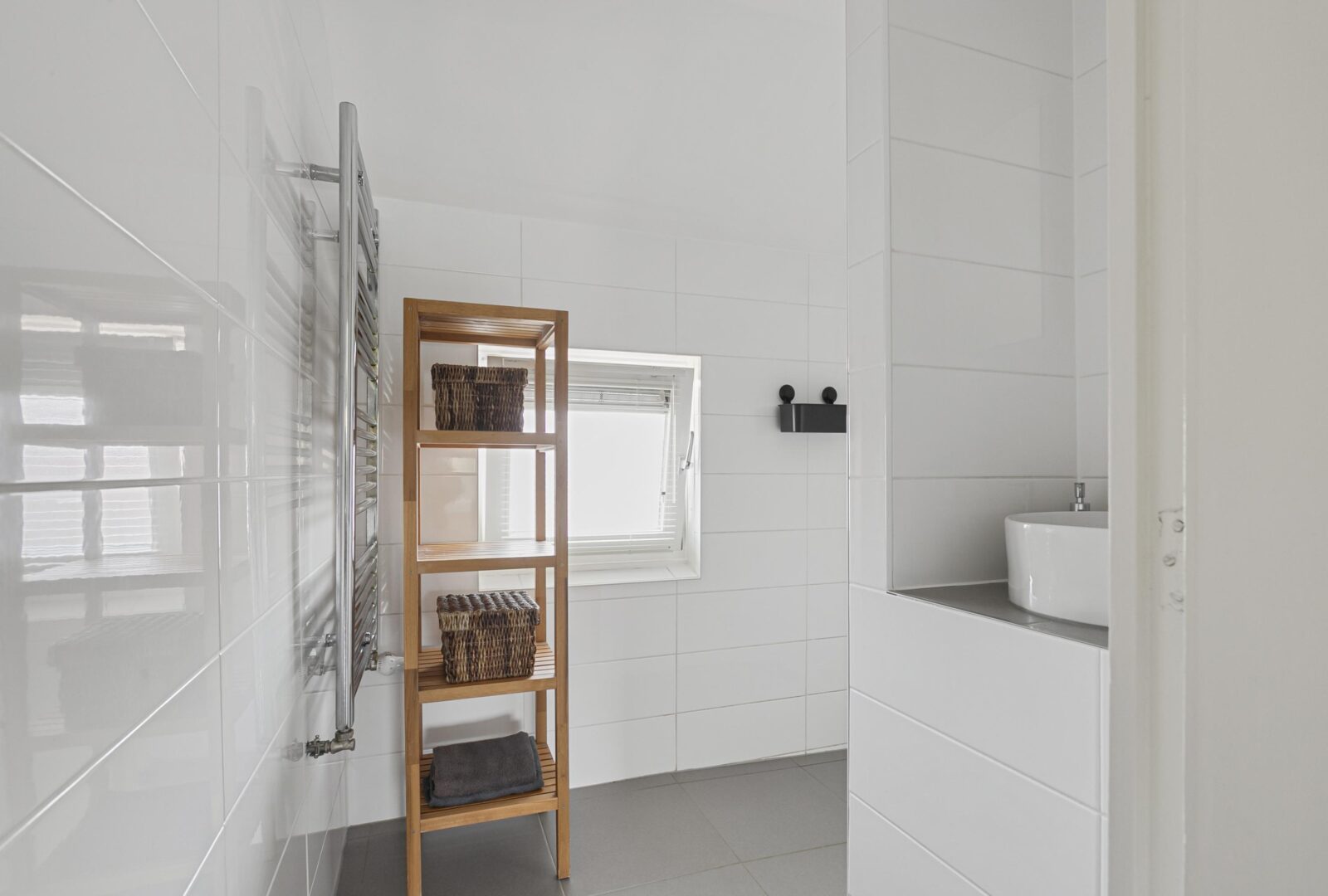 De overloop, voorzien van laminaat, brengt je naar drie slaapkamers: twee ruime kamers en een kleinere kamer, allen met een handige inbouwkast. De badkamer is modern en compleet, met een inloopdouche, designradiator en een fraai wastafelmeubel met spiegel. Op de overloop vind je bovendien een vaste kast met de cv-combiketel en ruimte voor de wasmachine en droger, praktisch weggewerkt.